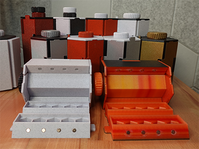 - Print one or more external trays, which you can use for dice management outside the box. Up to 3 empty trays can stack inside a plain bin.
